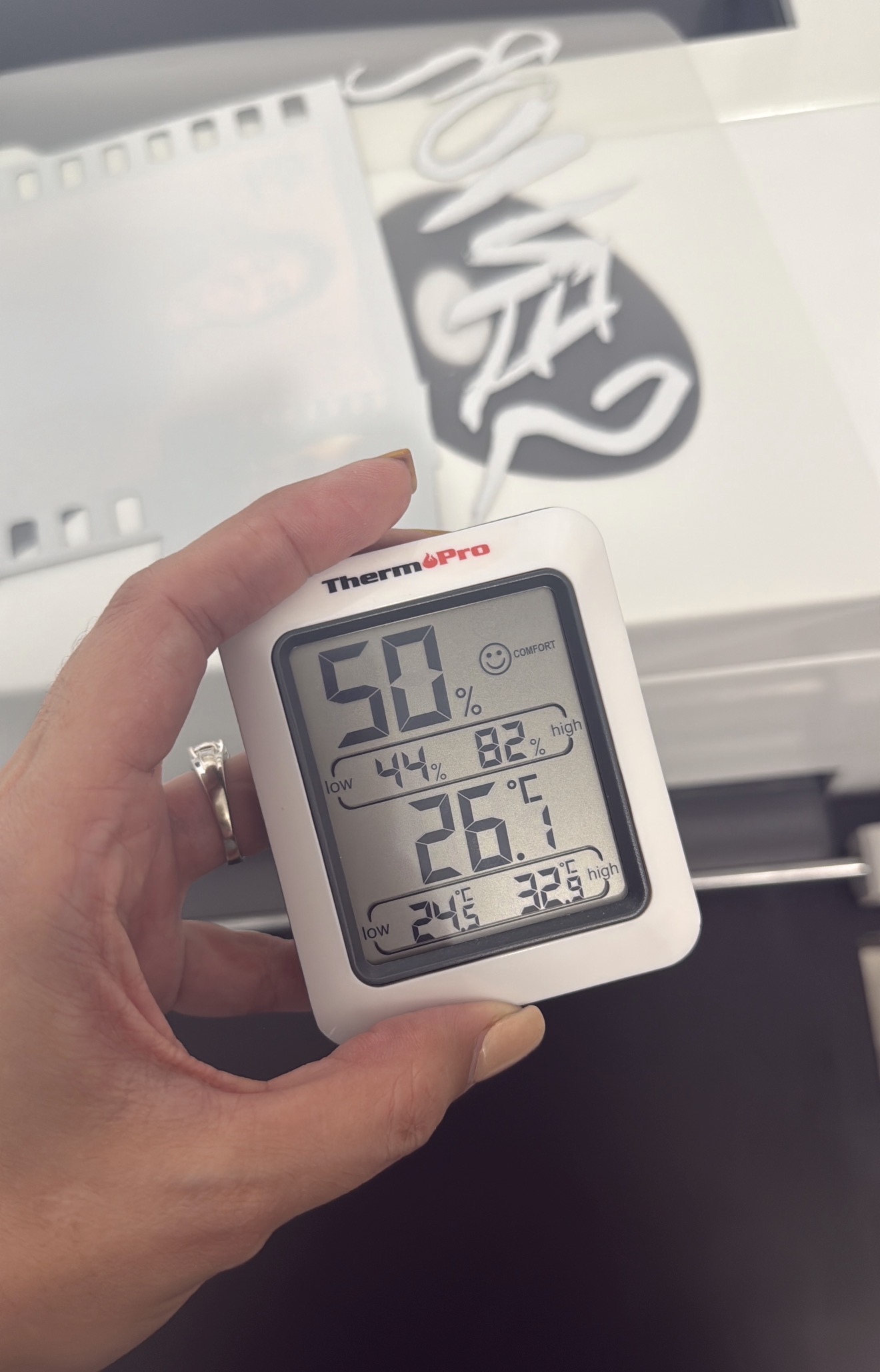 In my case, I use a magnetic thermometer to make sure the temperature in my workspace is always appropriate. Since I constantly face humidity challenges, I also use a dehumidifier to keep the environment under control and ensure consistent, professional, high-quality results.